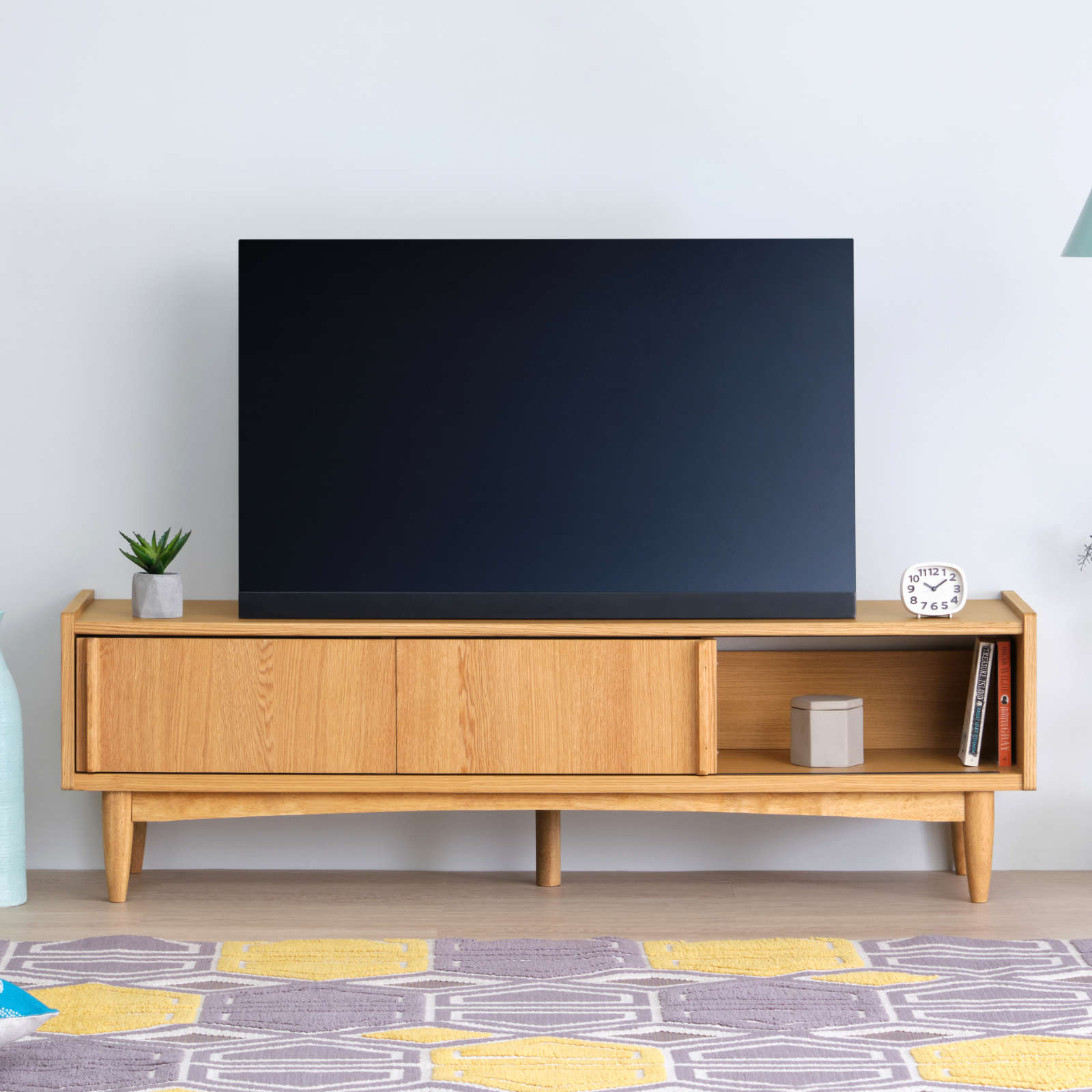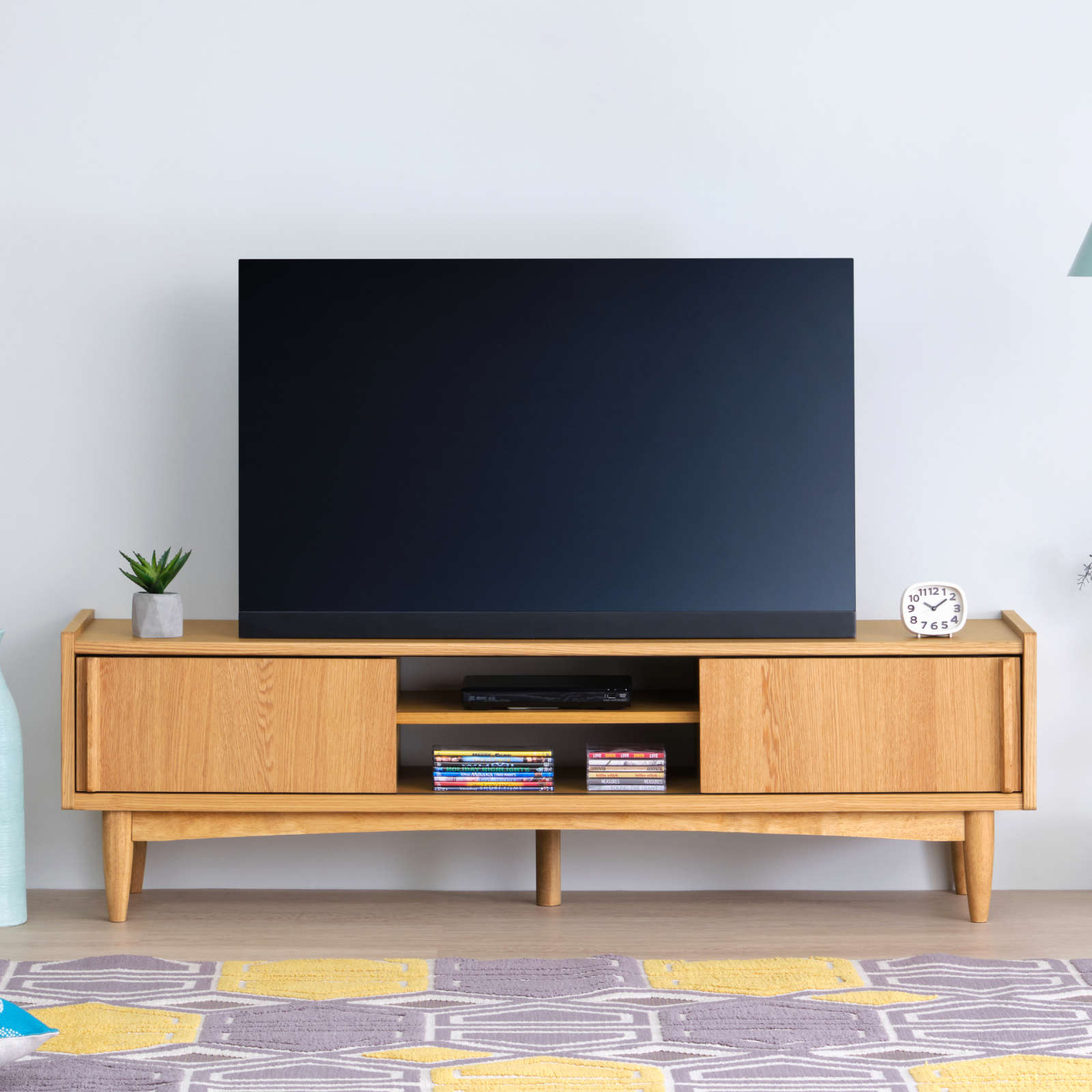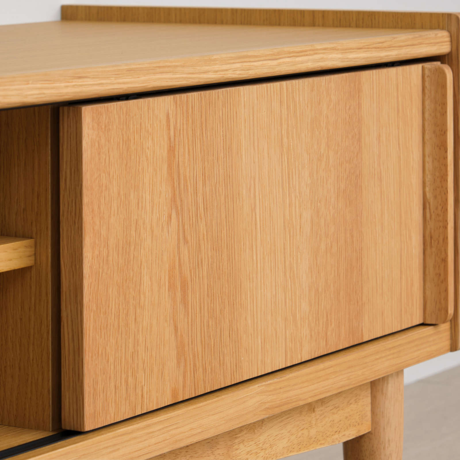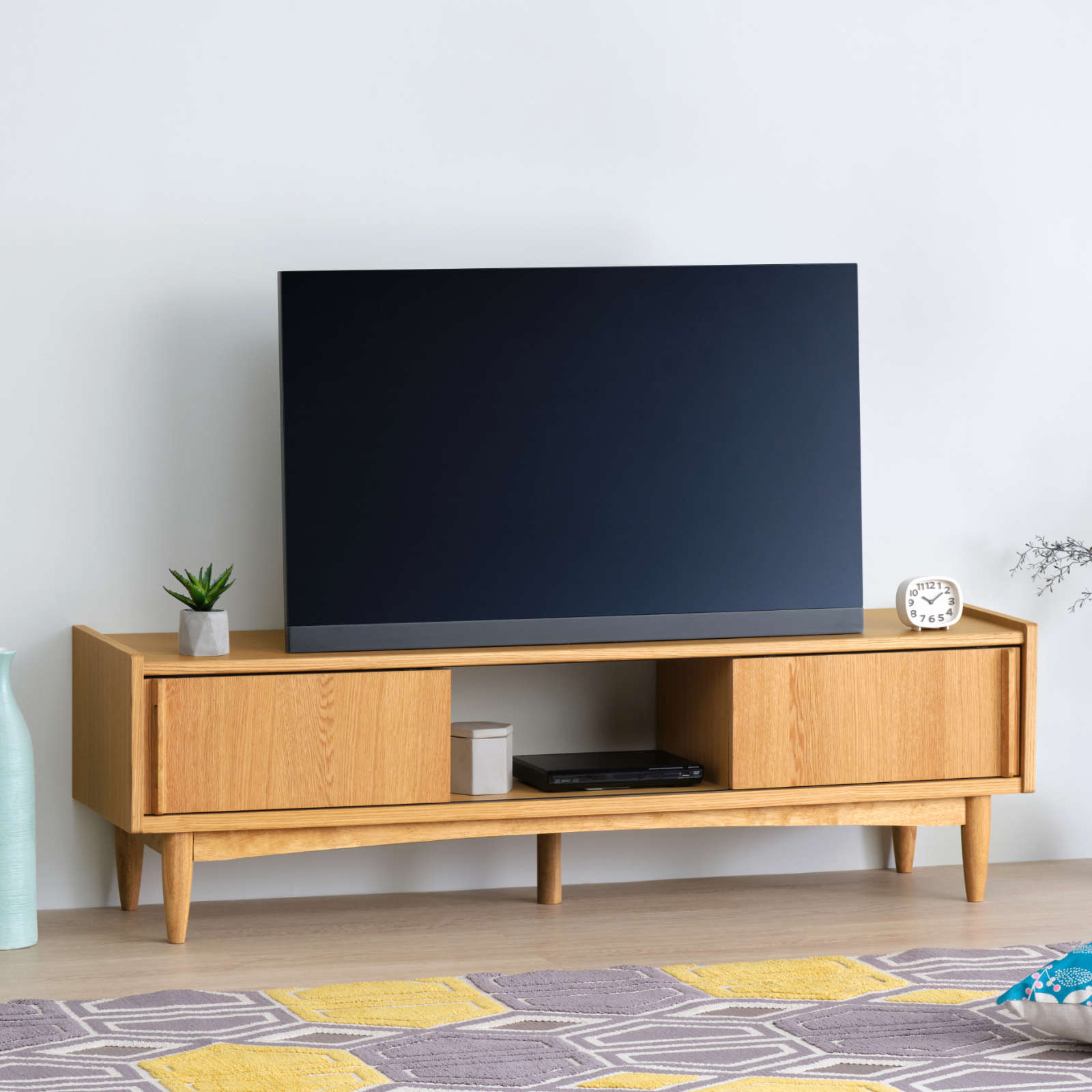 北欧ヴィンテージを意識した「引戸」に、天然木の突板を使ったナチュラルなテレビボードは、大型テレビが設置できるゆったりサイズです。北欧家具を思わせる洗練されたデザイン性と、配線などがスムーズに行えるように配慮された機能性を兼ね備えており、収納もたっぷりと設けられています。