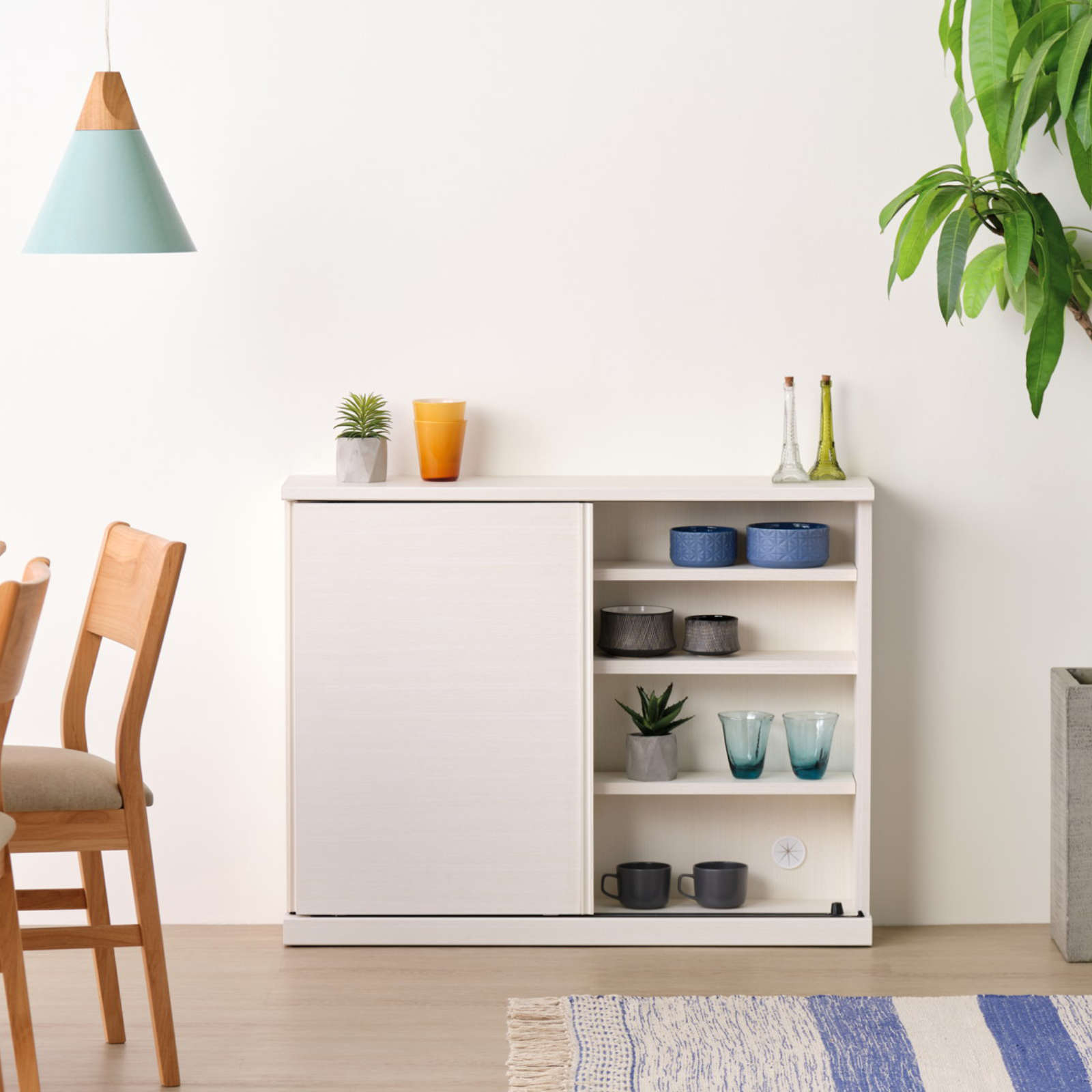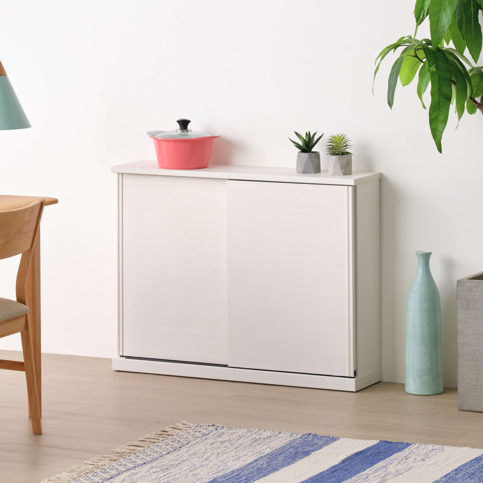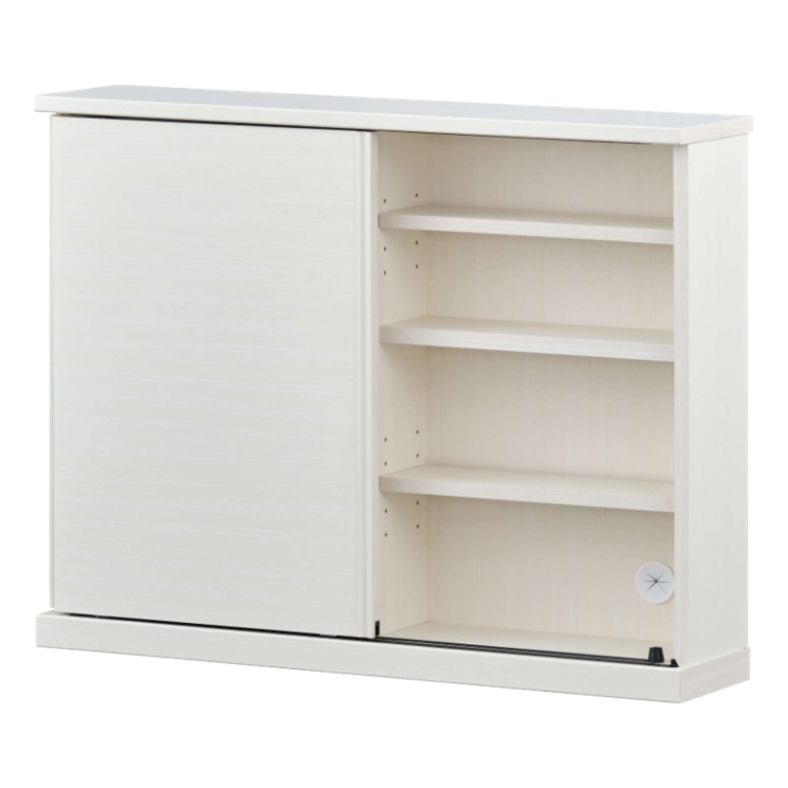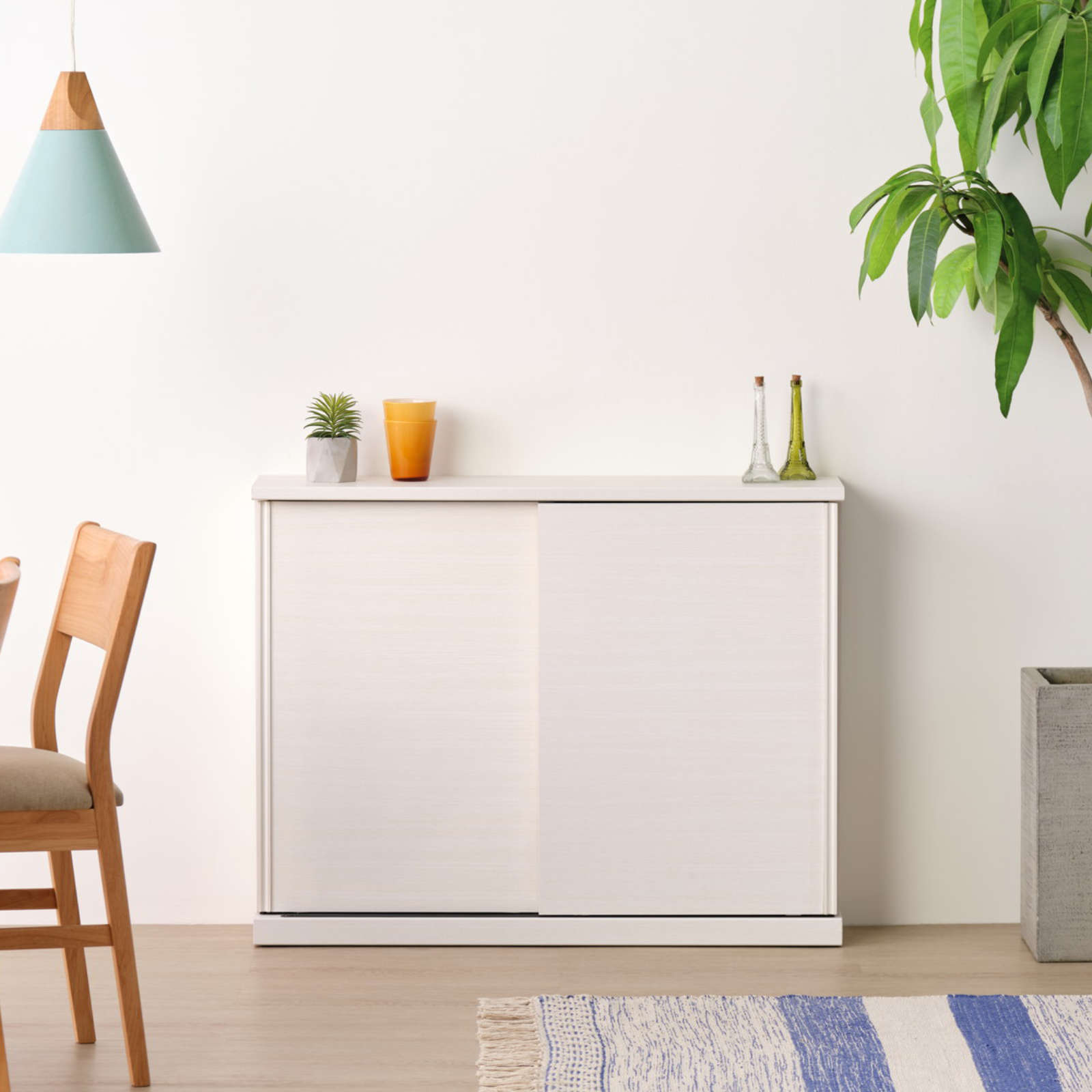 カウンター下にもぴったりなスリム収納「NIEVE」シリーズより、すっきりと清潔感あふれるデザインが美しい引き戸収納です。クリーンかつ爽やかな印象のホワイトカラーの木目を全面に採用し、お部屋を明るくしてくれる一台に。デザインを損なわないシンプルな取手や、スムーズな開閉をアシストするレールなど、細部までこだわりが光ります。