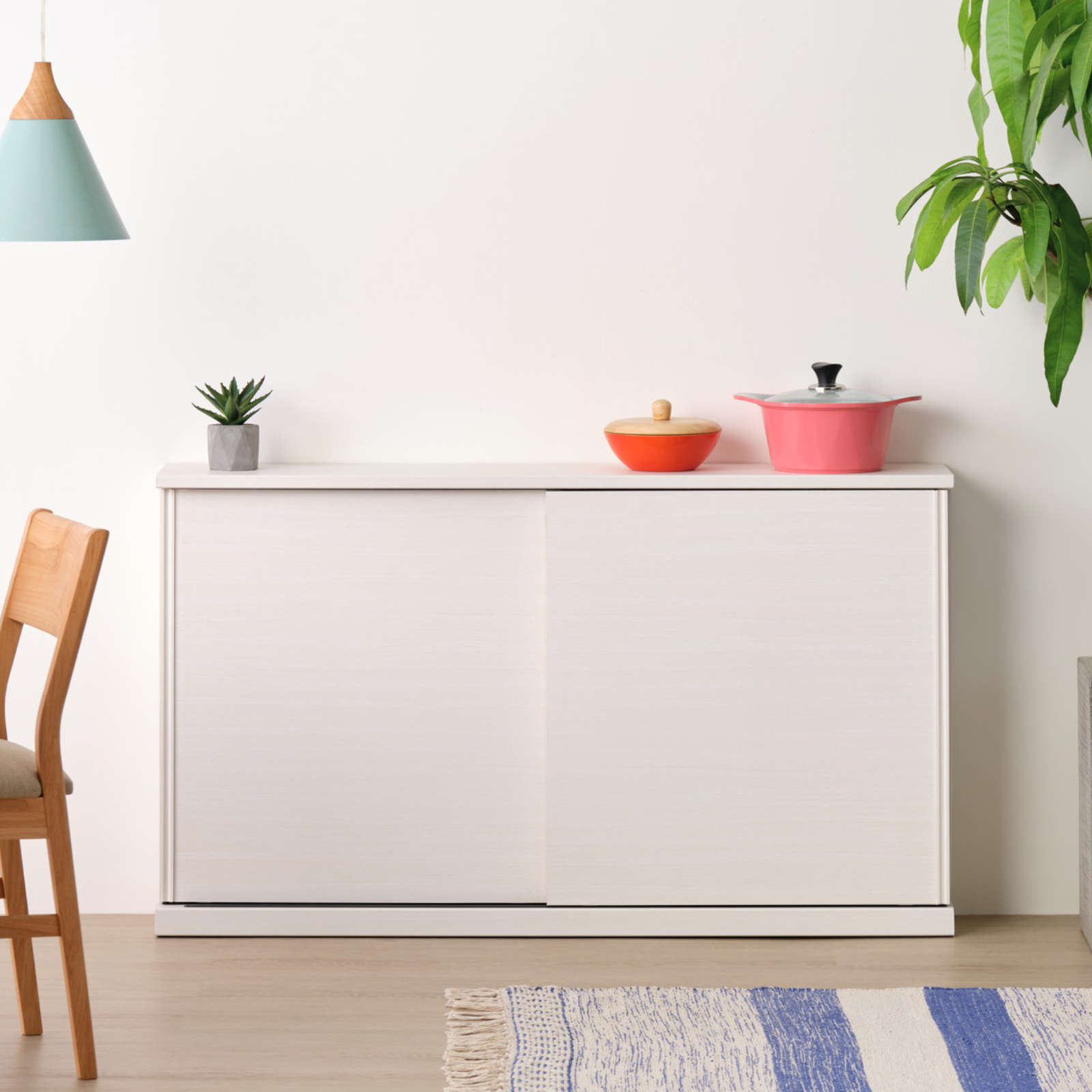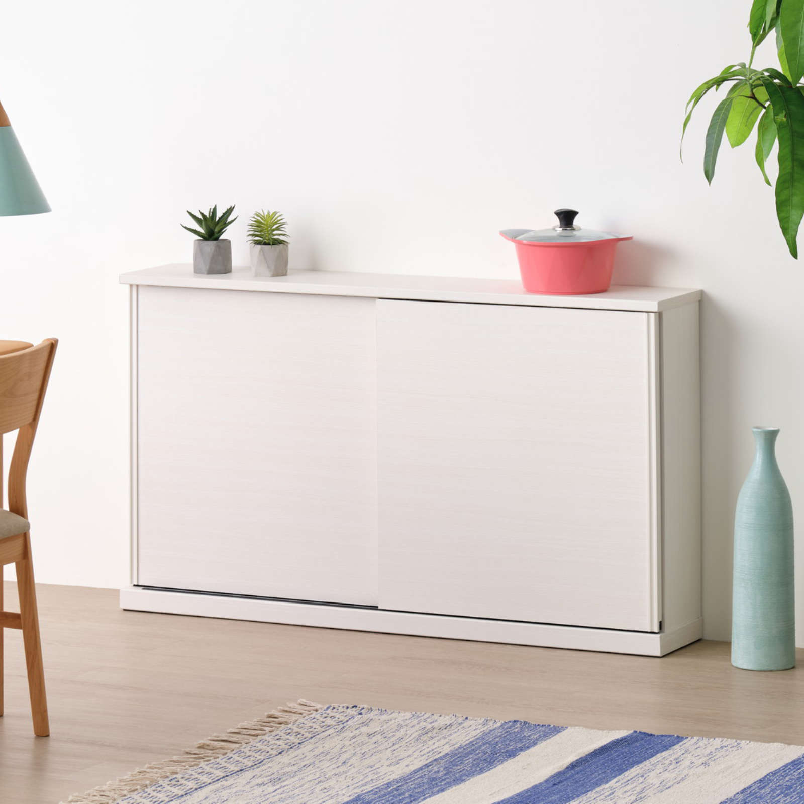 カウンター下にもぴったりなスリム収納「NIEVE」シリーズより、たっぷり収納できるワイドな引き戸収納です。ホワイトカラーの木目がお部屋を爽やかに彩り、清潔感のある美しい空間を演出してくれます。シンプルで扱いやすい取手や、スムーズな開閉をアシストするレールなど、使い勝手にこだわった設計にも注目の一台です。