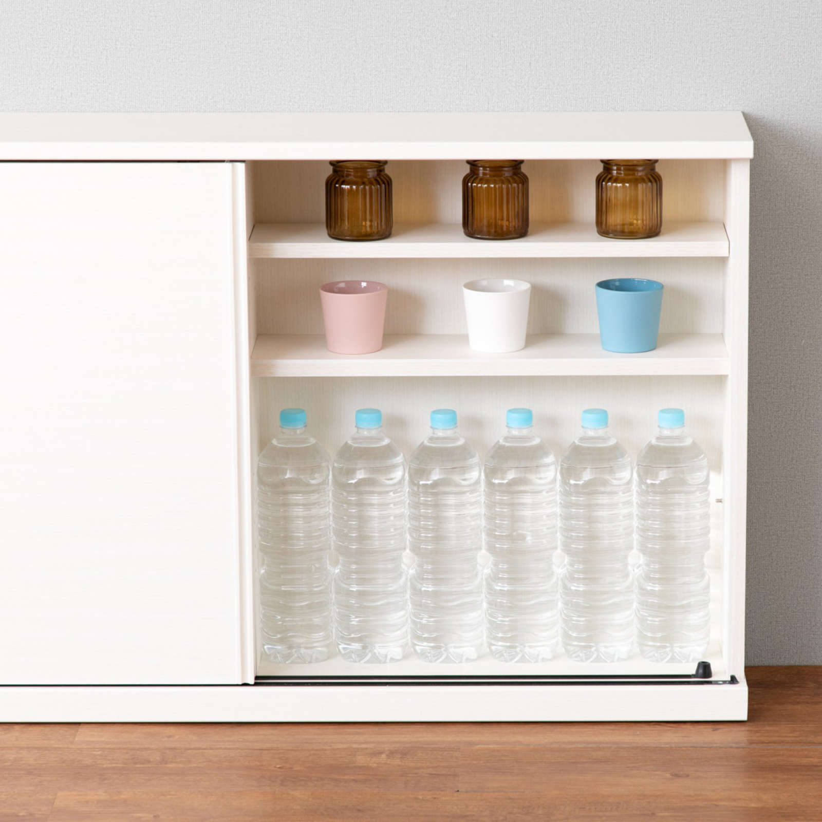 ホワイトの木目が美しい、スリム&ワイドな引戸収納