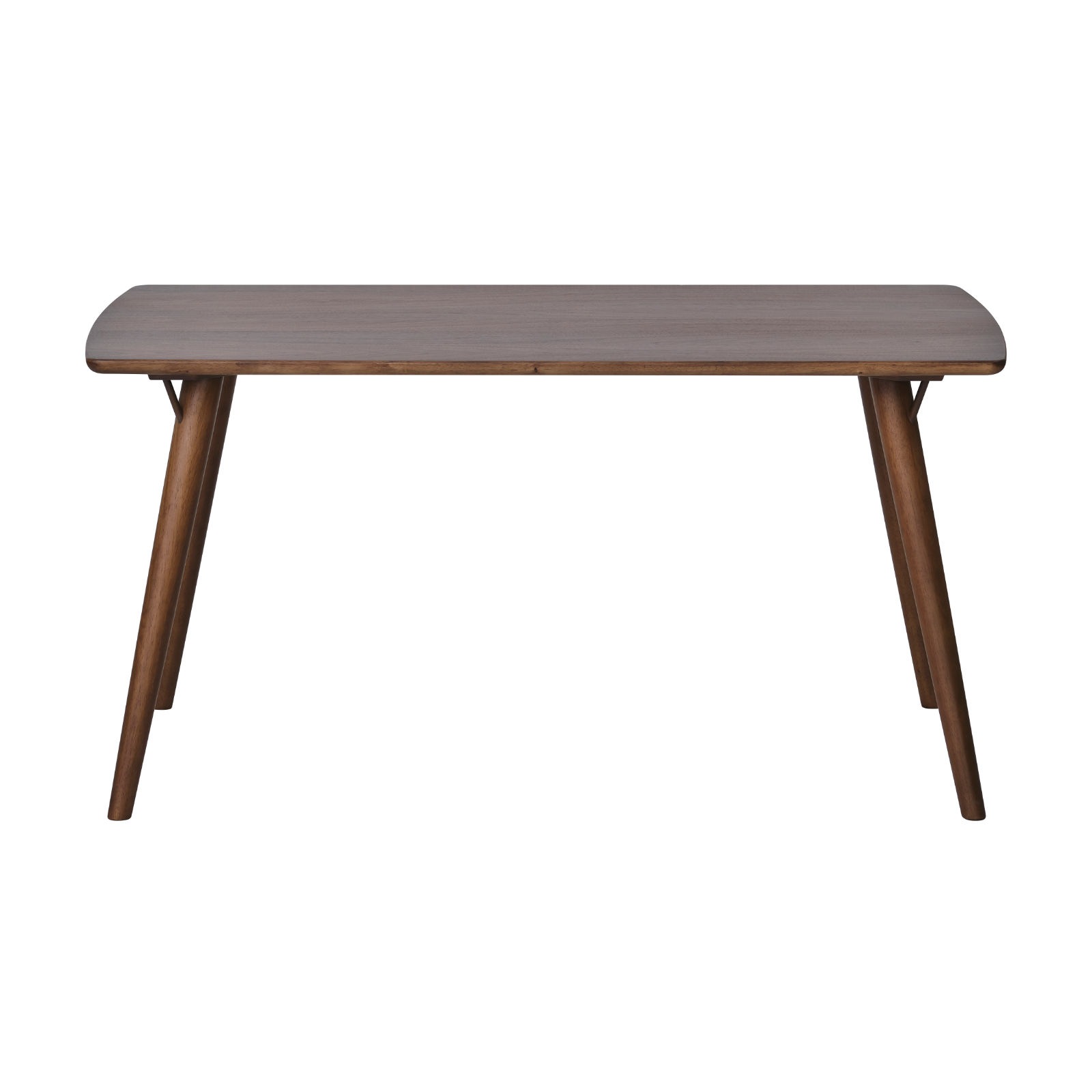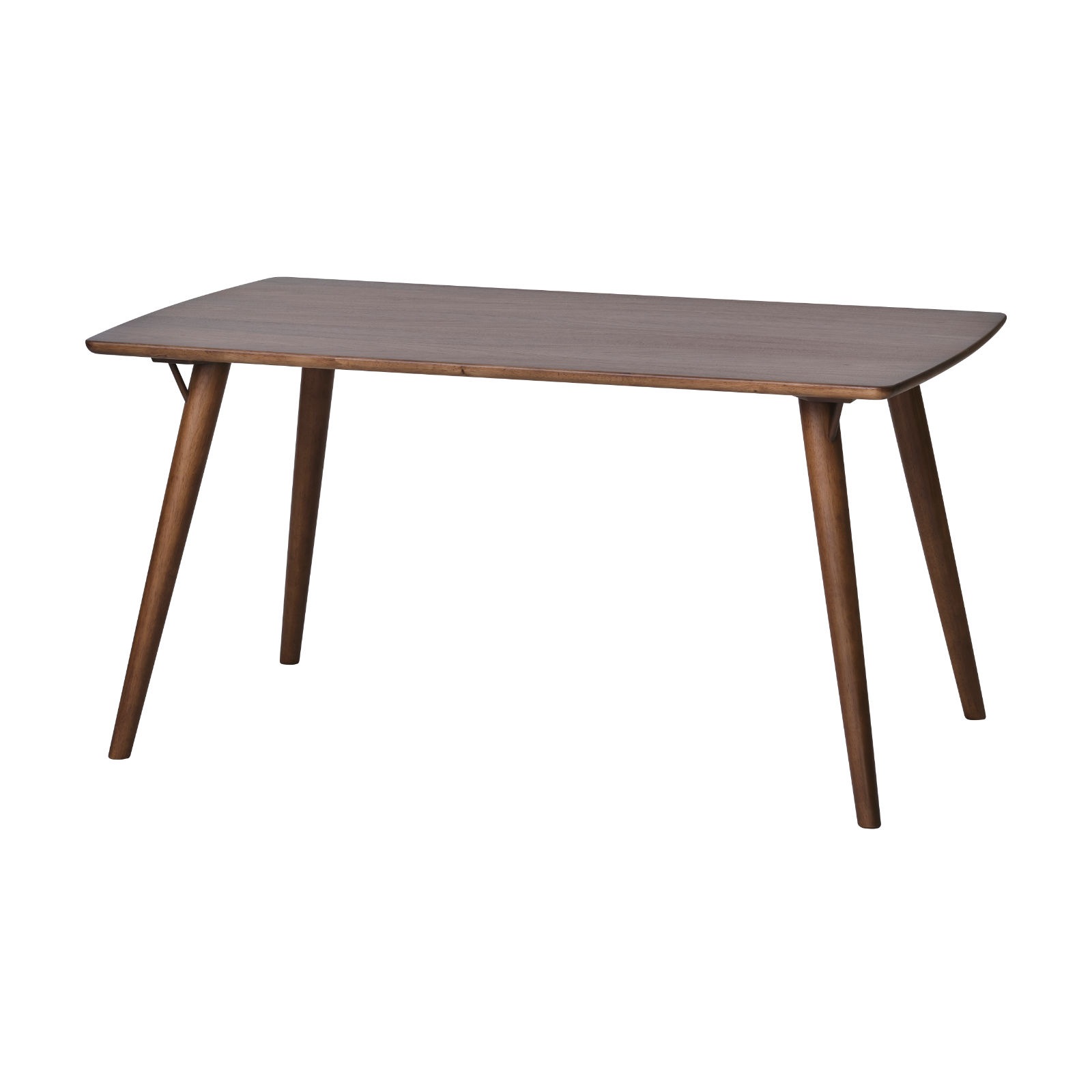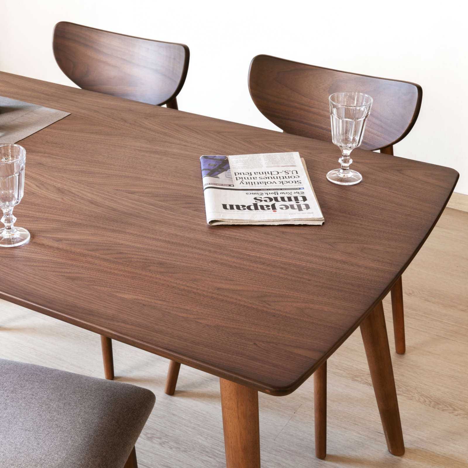 シンプルで合わせる空間を選ばない、シックなダイニングテーブル。天板には大人の落ち着きを感じさせるウォルナット材の突板が使用されています。床にむけてゆるやかに開いた脚が、ほどよい個性をプラスしているのもポイント。幅140cm×奥行80cmの幅広い天板は、お食事やお勉強、作業と多用途にお使いいただけます。また、密度の高い木材を使用し、高い強度を備えた一台。天板は四隅に角のない優しいデザインで、小さなお子様のいるご家庭にもおすすめです。