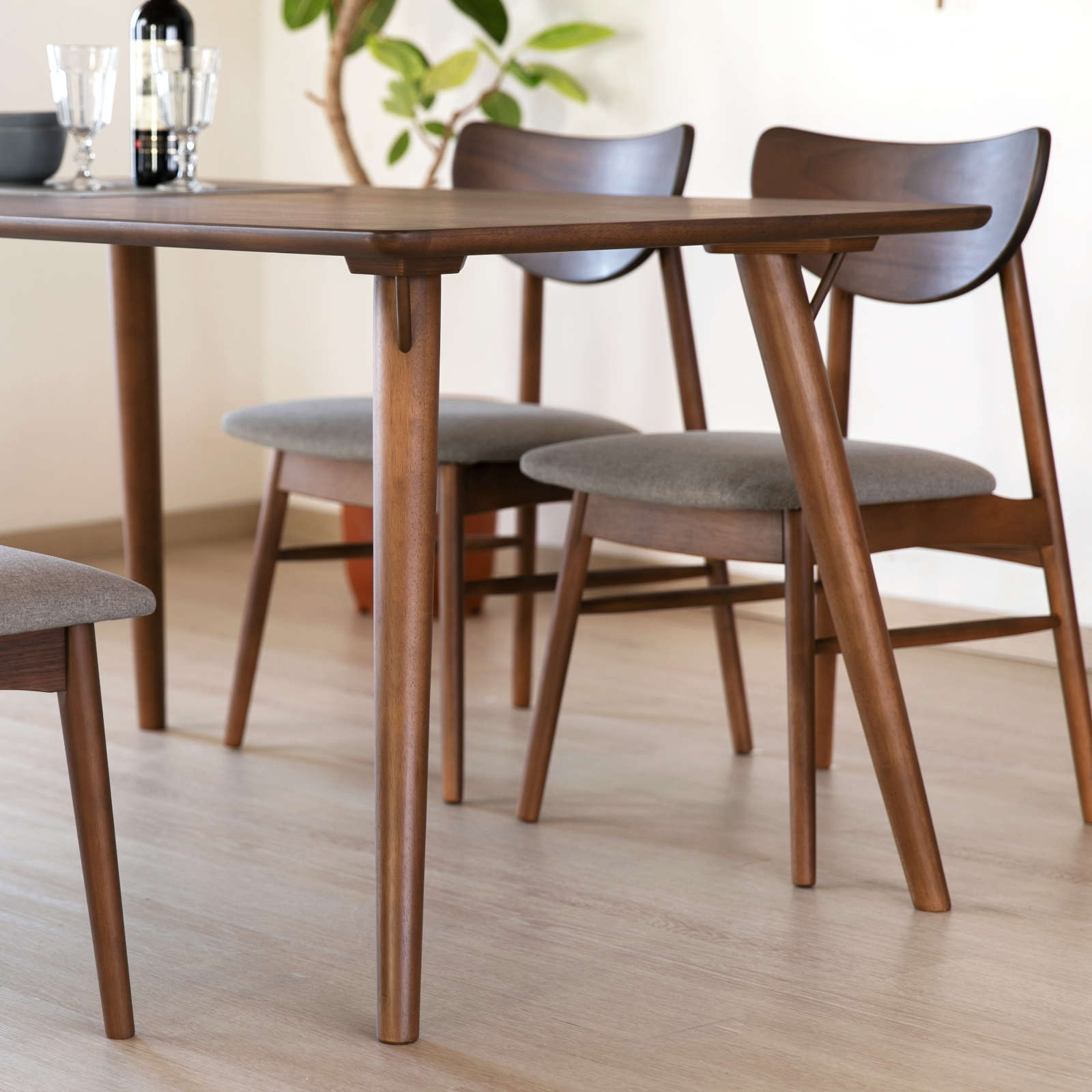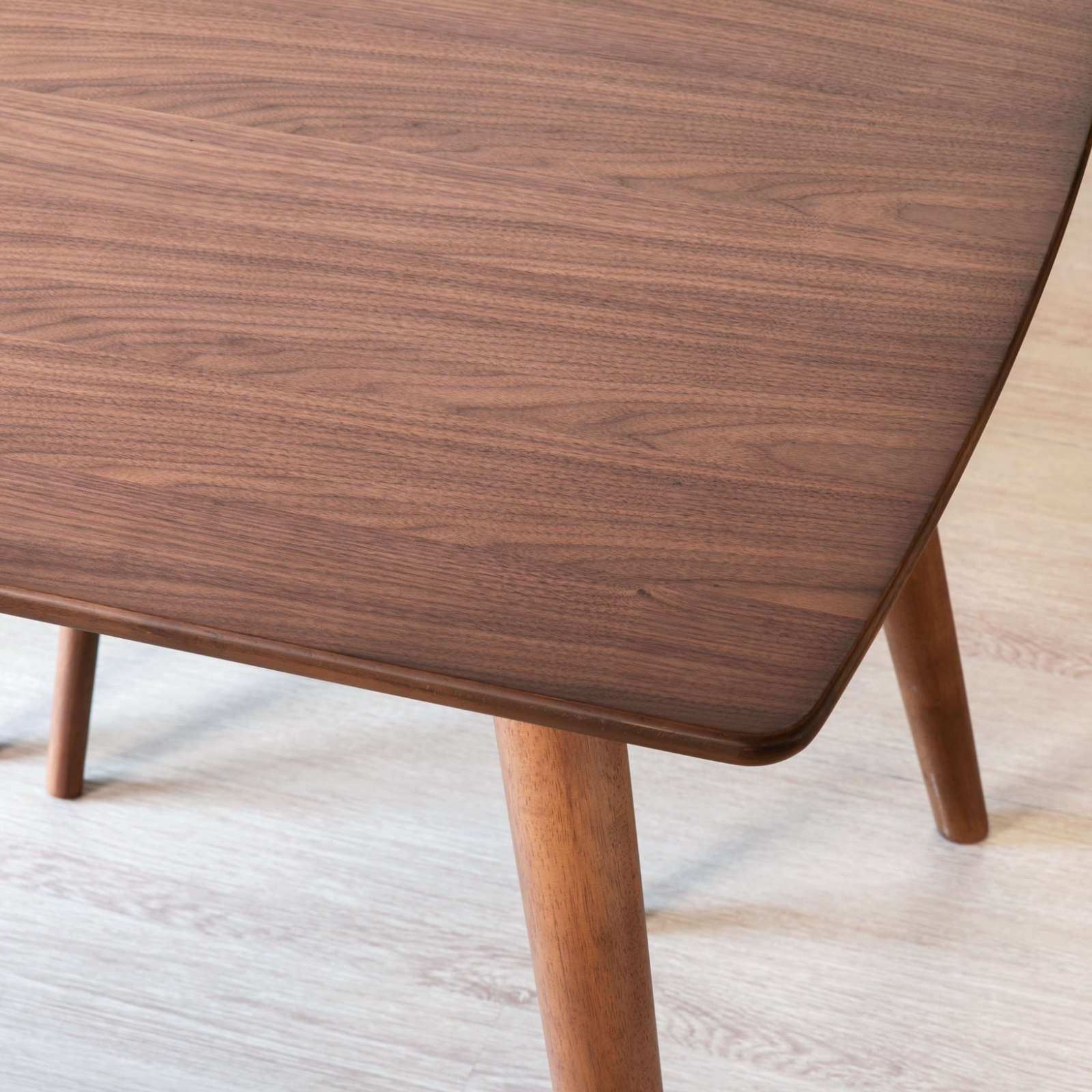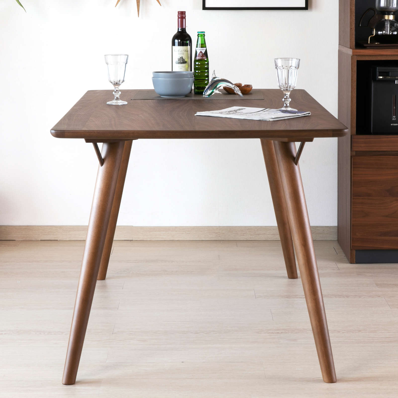 シンプルで合わせる空間を選ばない、シックなダイニングテーブル。天板には大人の落ち着きを感じさせるウォルナット材の突板が使用されています。床にむけてゆるやかに開いた脚が、ほどよい個性をプラスしているのもポイント。幅140cm×奥行80cmの幅広い天板は、お食事やお勉強、作業と多用途にお使いいただけます。また、密度の高い木材を使用し、高い強度を備えた一台。天板は四隅に角のない優しいデザインで、小さなお子様のいるご家庭にもおすすめです。
